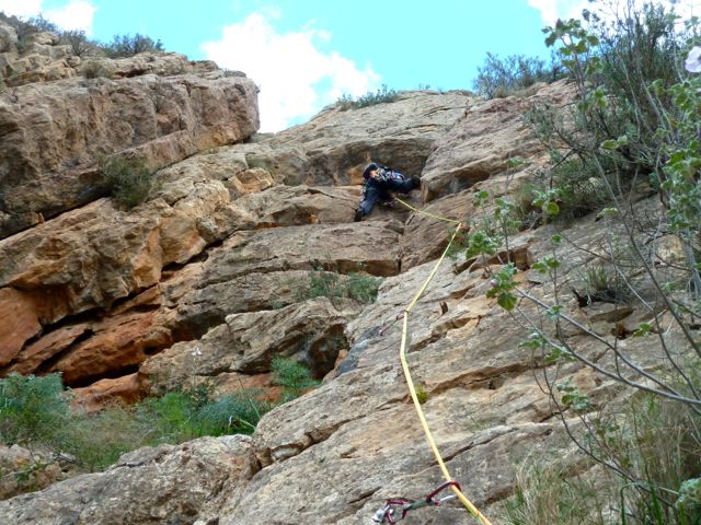 El primer llarg comença amb un pas difícil, costa situar-se després segueix vertical amb roca excel.lent amb passos divertits. R1 35 metres. Vè