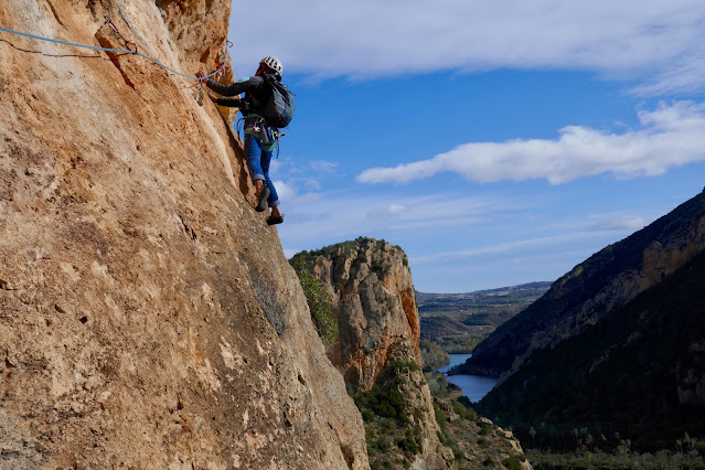 Vista de costat, ja es veu que no és una escalada difícil, però avui el fort vent i el fred que s'ha girat ens ha fet pensar en baixar des de la primera reunió, però al final hem seguit.