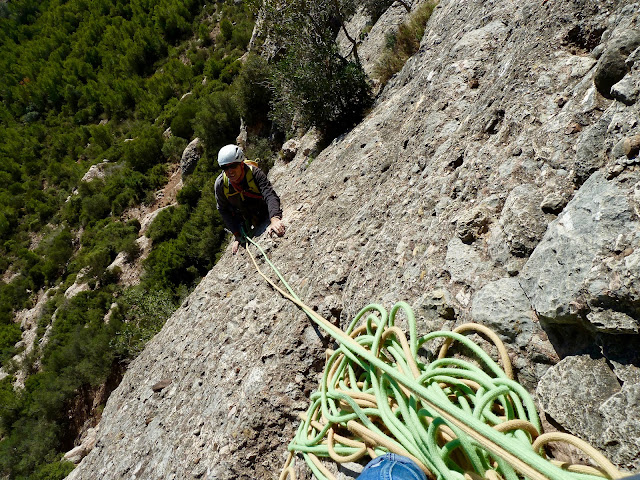 Un primer llarg una mica brut, on les bagues de les savines estan totalment malmeses, però això no és un problema perquè es poden posar sense problemes. El problema està en algun boix, que sembla que ha passat la papallona i la deixat ben sec. Segurament tornaran a brotar. De totes maneres, podrem posar-hi assegurances flotants sense problemes.